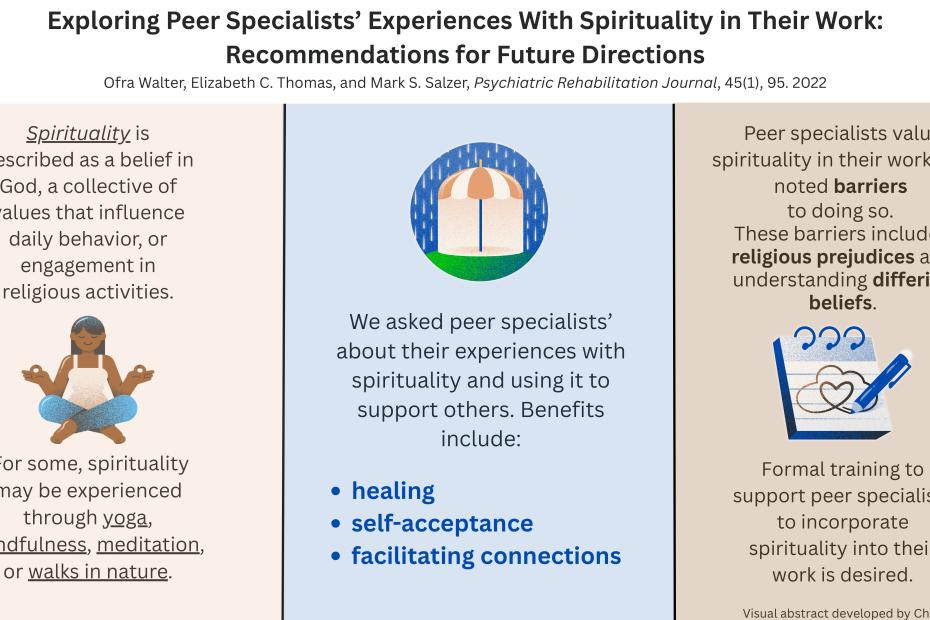 A visual abstract detailing a published article on how peer specialists use spirituality in their work and give the recommendations for future directions.